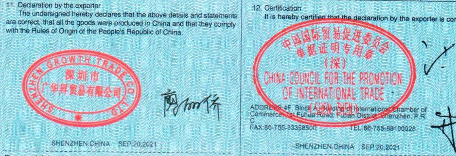4.產(chǎn)地文件須附有中國(guó)國(guó)際貿(mào)易促進(jìn)委員會(huì)專用章及發(fā)貨人印章。
